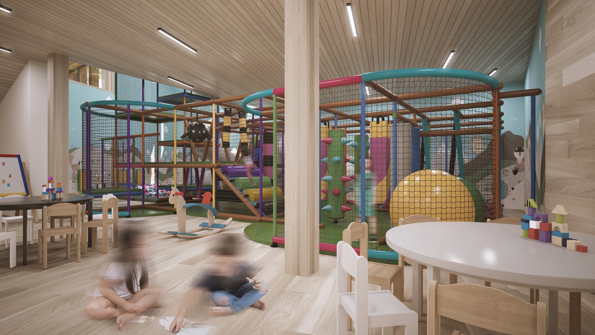 The children whirl down the spiral slide, jump into the ball pit, balance across hanging ropes and conquer every climbing element